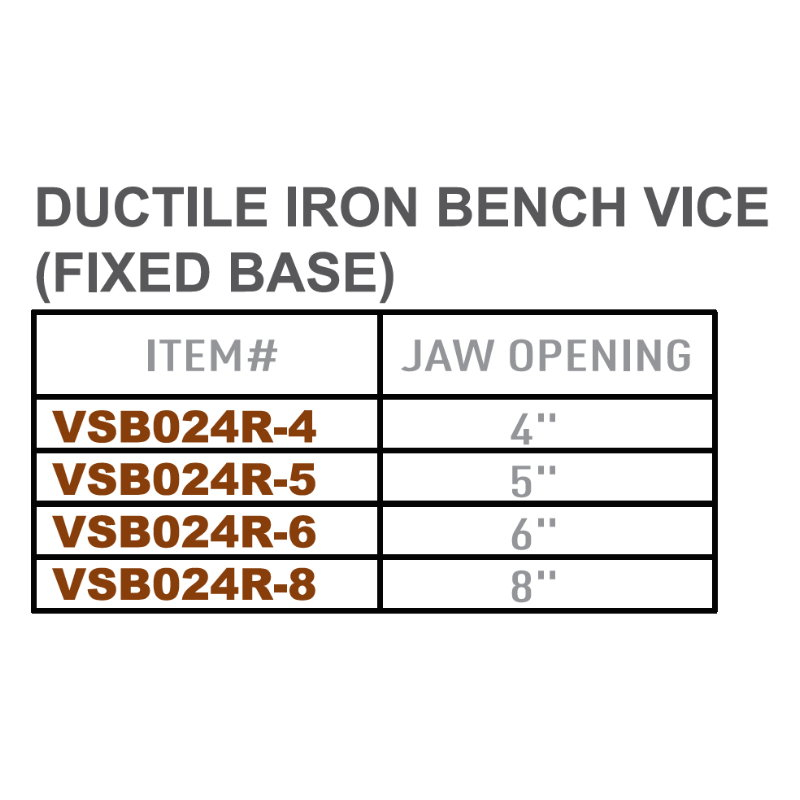 * Jaw opening: 4"* Throat depth: 2-5/8"* M: FCD45 (Ductile iron)* Hardness of vise jaw: HRC 25-30°* Finished: Bake paint* Length: 360mm