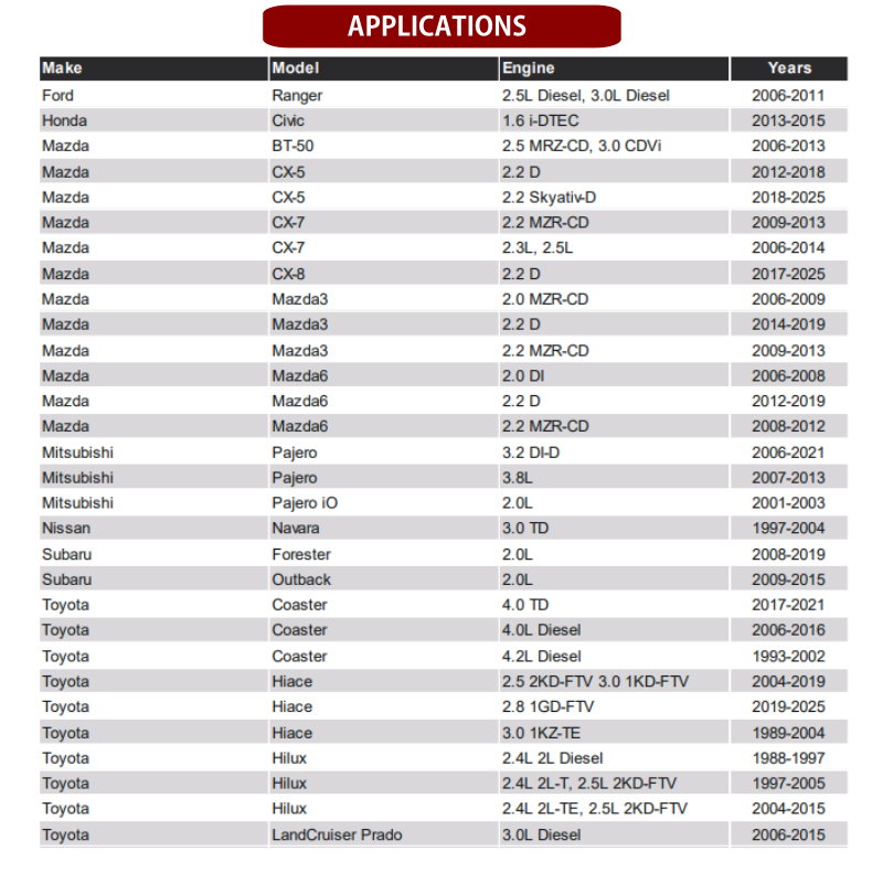 * Fitting Ford, Mazda, Mitsubishi, Nissan, and Toyota diesel engines