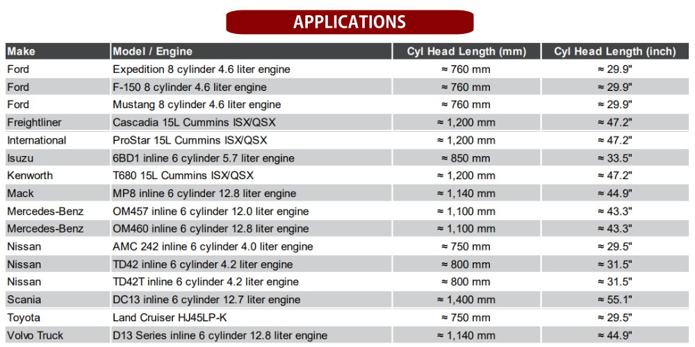 * Suitable for inline 6-cylinder or 8-cylinder engines with more than 600mm in length, espcially for pickup trucks